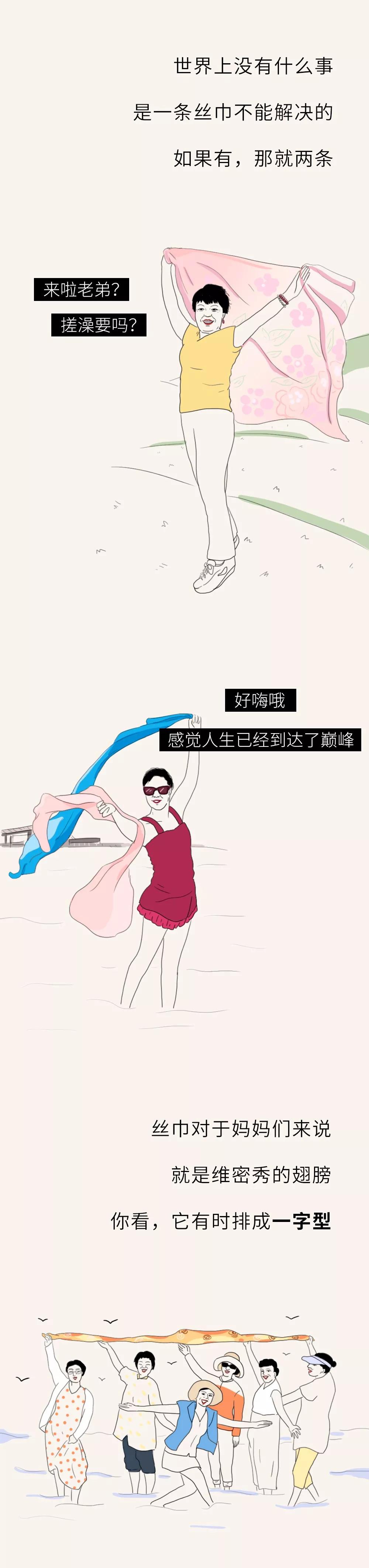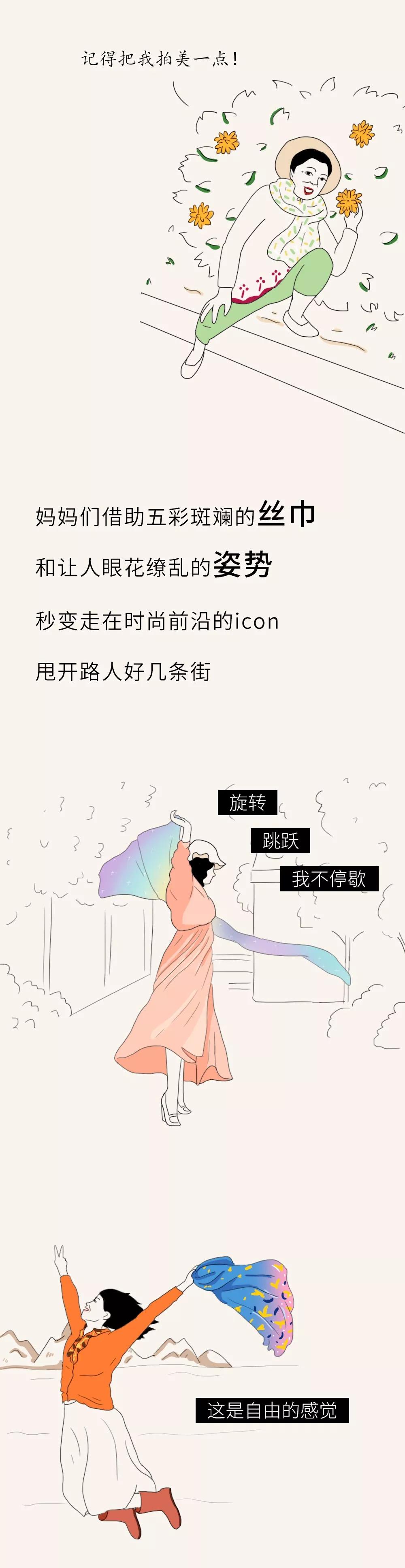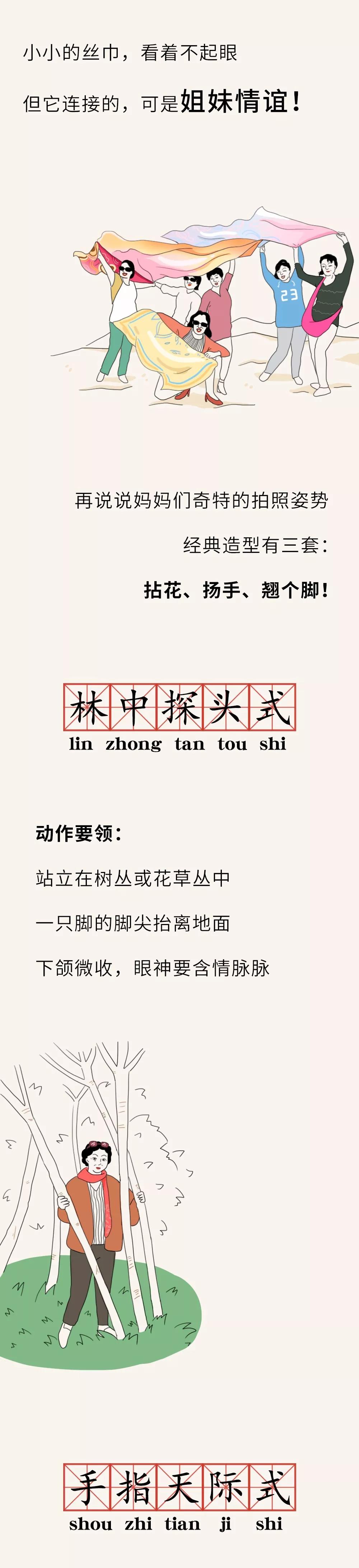 每次一到景區(qū),身披各色絲巾的大媽們,絕對(duì)是一道亮麗的風(fēng)景線:她們紅得像火、粉得像霞、綠得像草、白得像雪、藍(lán)得像天,憑自己的實(shí)力向你證明:什么才叫五彩斑斕。她們的人生信條就是:頭可斷,血可流,絲巾不能丟。絲巾舉過頭頂?shù)哪且凰查g,感覺自己就是Super star。對(duì)于她們來(lái)說,萬(wàn)物皆可盤拍:除了景區(qū)的標(biāo)志性建筑、各種帶字的標(biāo)牌、花草樹木,還有石獅子、雕像、欄桿等等,甚至連路邊發(fā)傳單的玩偶也不放過……
