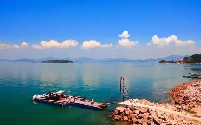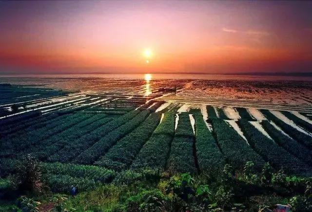傍晚時(shí)分,林木茂密,水天一色,翠峰鵠立,湖中白帆點(diǎn)點(diǎn),波光粼粼,一片寧?kù)o淡泊的世外桃源景象。