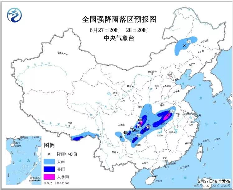 ·27日20時至28日20時,四川東部和南部、重慶、貴州北部、云南東北部、陜西東南部、河南南部、安徽西北部、湖北中西部、湖南西北部等地的部分地區(qū)有大到暴雨,其中,重慶北部、四川東北部、河南南部、湖北東北部等局地有大暴雨,最大小時降水量30~60毫米,局地可達70毫米以上,并伴有雷暴大風等強對流天氣。