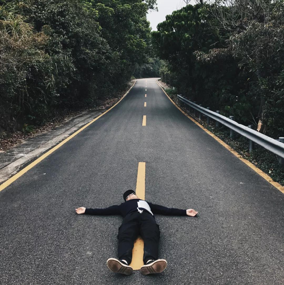 馬路上通常都會有標記的線條,而這就是一個很好的利用道具。比較簡單的拍照姿勢就是人坐在線上、斜坐在線上,或者是邁開腿站在線上。