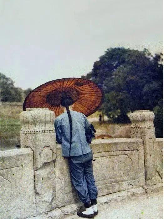 1912年,大同橋,一個(gè)男子打著傘靠在石橋上。
