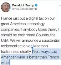 “雖然我不喝酒,但比起法國(guó),我更愛美國(guó)葡萄酒。”特朗普26日在社交媒體發(fā)文對(duì)此前法國(guó)的數(shù)字服務(wù)稅做出回應(yīng)…