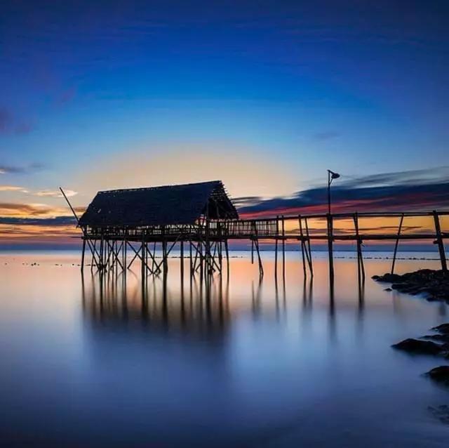 將水平線、地平線放在畫面的正中間,這種構(gòu)圖方式在風(fēng)光攝影中雖然不常見,但也會(huì)使用。比如,攝影師想要突出位于湖面上的小亭子,而小亭子又正好擁有一段很長的長廊。我們就可以將這段長廊作為一條水平線來構(gòu)圖。