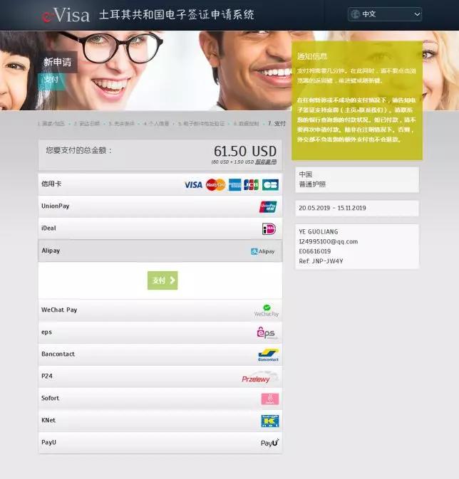 進(jìn)入付款頁面,支付61.5美元的費用,其中60美元為簽證費,1.5美元為服務(wù)費。