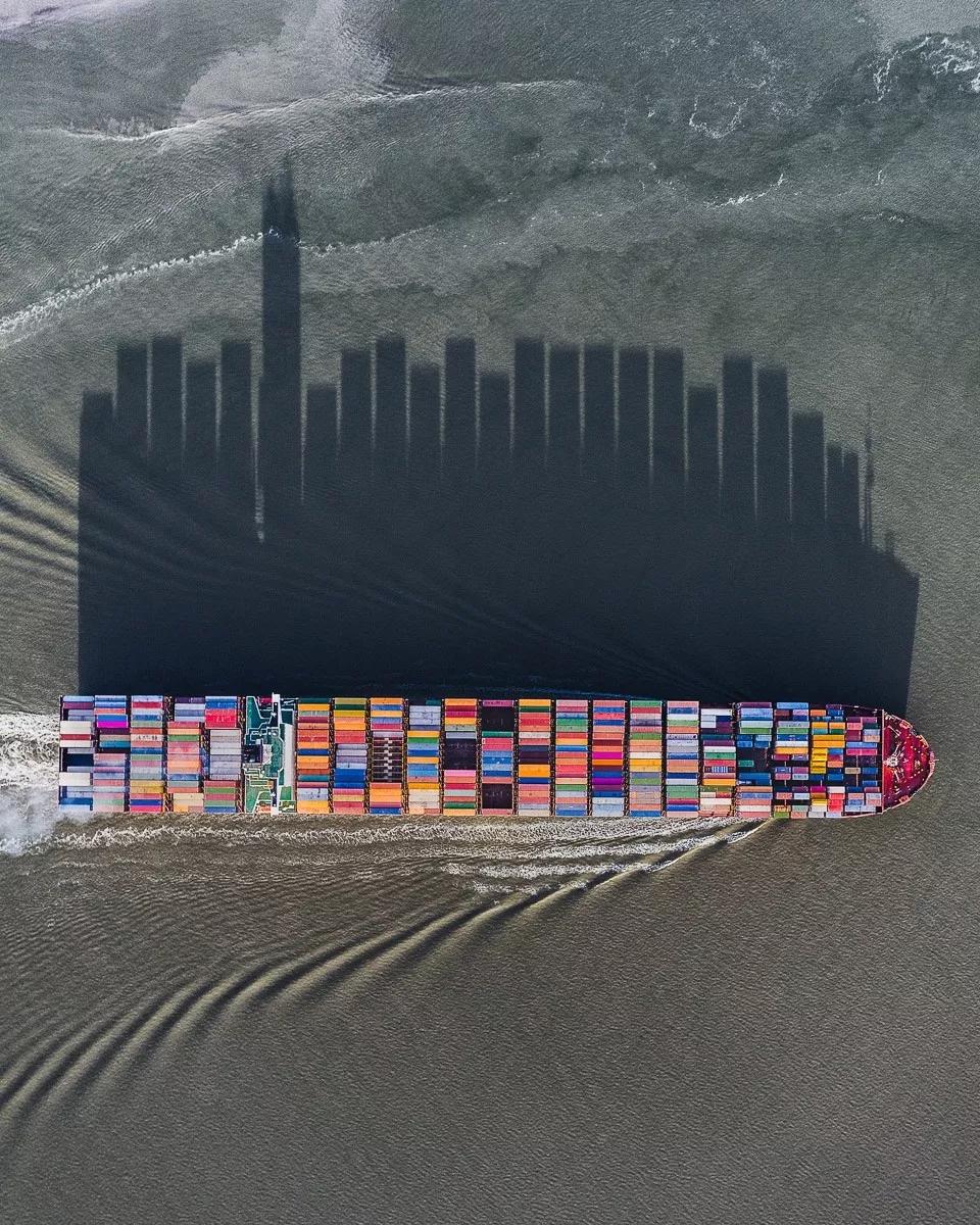 比如,名為城市輪廓(Skyline)的圖片拍攝了一艘正在水域上航行的貨船。這艘貨船上的集裝箱在水面上投射出的影子就像是一座城市輪廓線,令人眼前一亮。