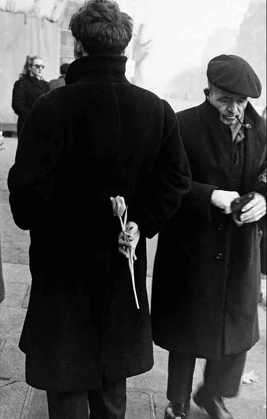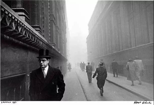 返回紐約后, 1949~1953 年期間,弗蘭克又多次前往歐洲各國,先是拍攝花都巴黎,制作了一本以鮮花為主題的影集,送給他的未婚妻;后來拍攝了英國倫敦濃霧中銀行家頭戴圓頂禮帽、身著大衣、手持雨傘或手杖來去匆匆的典型英國人形象,以及滿臉漆黑的威爾士礦工辛苦勞動(dòng)的照片;在西班牙他捕捉到一頭背插匕首的牛面對(duì)斗牛士的精彩畫面。他在每座城市都尋找最有代表性的意象,通過片斷的、稍縱即逝和內(nèi)省的個(gè)人化影像,并將它們作為一個(gè)整體,共同表達(dá)他對(duì)該城市的感受。