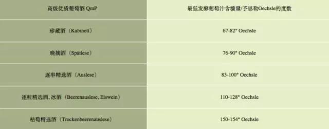 其最低含糖量的標(biāo)準(zhǔn)用予思勒(Oechsle)來表示,一度予思勒表明一升葡萄汁比一升水重一克,具體標(biāo)準(zhǔn)如下(其范圍是因為各產(chǎn)區(qū)標(biāo)準(zhǔn)不一):