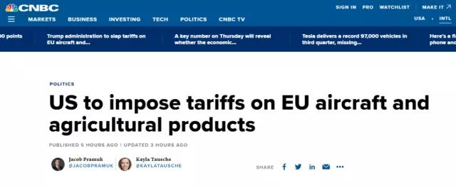 近日,美國(guó)政府對(duì)歐洲多類(lèi)產(chǎn)品征收25%的關(guān)稅,共計(jì)征收75億美元(相當(dāng)于69億歐元,在WTO歷史上創(chuàng)紀(jì)錄的)的新關(guān)稅。以報(bào)復(fù)波音公司和空客公司之間的爭(zhēng)端,并稱(chēng)這是對(duì)歐洲對(duì)空客補(bǔ)貼長(zhǎng)期貿(mào)易戰(zhàn)的回應(yīng)。