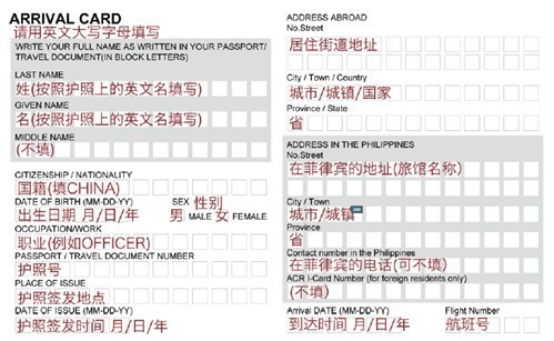 中國公民在結束菲律賓觀光旅游,于機場辦理出境登機手續(xù)前,應先交納機場稅,然后到訂購返機票的航空公司柜臺前辦理出境登機手續(xù),領取登機卡和行李卡,同時向航空公司工作人員遞交出境卡。出境卡的填寫內(nèi)容同入境卡基本相同。