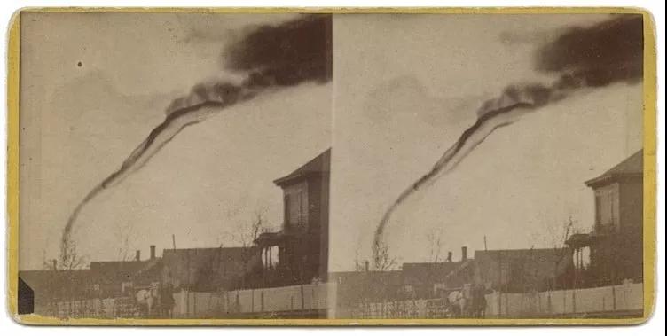 目前最早可知的龍卷風照片是在美國堪薩斯州拍到的。1884 年4 月26 日,一陣龍卷風緩慢地刮過堪薩斯州的安德森縣,這給了業(yè)余攝影師A.A. 亞當斯(A.A. Adams)設置他箱式相機的機會和時間。