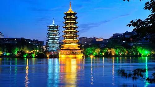 游覽新地標(biāo)【日月雙塔】(登塔約40分鐘),座落在桂林城的中軸線上,與象山上的普賢塔、塔山上的壽佛塔,相互呼應(yīng),相互映襯,有“四塔同美”之說,是兩江四湖環(huán)城水系中最著名的旅游景點(diǎn);