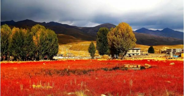 早上:8:30乘坐觀光車出亞丁景區(qū),后乘車至稻城后經桑堆鎮(zhèn)觀【紅草地】(注:紅草地為季節(jié)性景觀,只有在每年的9月底到10月初才能看到此處的草原呈紅色),在秋天的時候,配合上后面泛黃的樺樹,倒映在水塘中,是許多書上所介紹的美景,之后翻越古冰川遺跡海子山到達丁真家鄉(xiāng)--理塘。