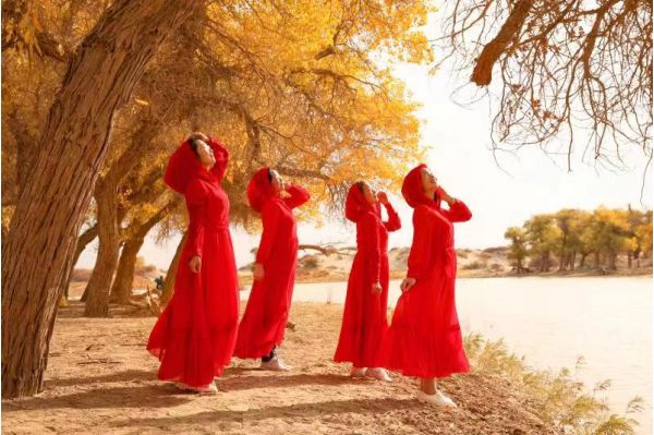 4、穿戴合適的服飾:衣飾最好選擇純色為主(紅色、白色等),以紗質(zhì)/絲質(zhì)披巾為主,突出人物色彩。今天大家可以穿一些紅色、藍(lán)色、白色的衣物,搭配胡楊林的漫天黃葉,十分漂亮。