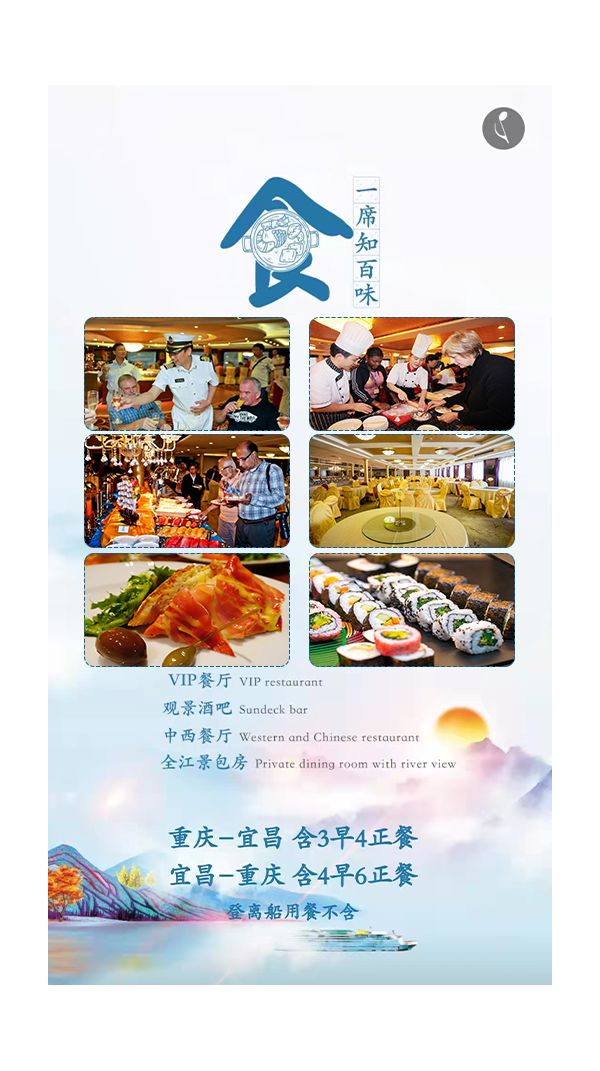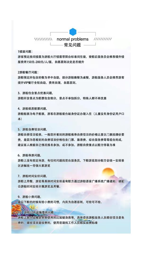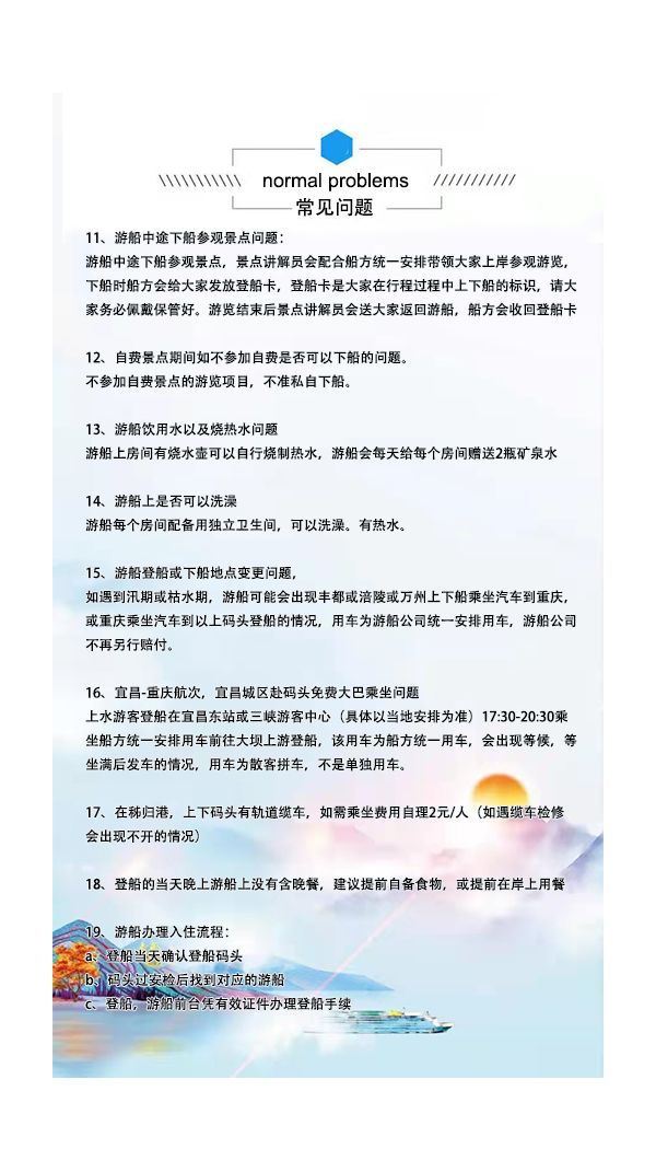 17:00——晚餐成人:不含餐 兒童:不含餐登船當日(大多數(shù)游船)晚餐不在船票所含安排之內(nèi),建議可晚餐后登船。 1、常規(guī)重慶登船為朝天門碼頭,然而朝天門碼頭又細分為十幾個小碼頭,游船??烤皖愃朴诨疖囃?空九_一個道理,游船具體停靠在朝天門的幾號碼頭以實際??繛闇剩瑸榱朔乐褂未R時變更??看a頭,造成走錯碼頭的情況出現(xiàn),一般我們會在登船當天中午找游船前臺再次核實登船碼頭后中午12點前告知您具體朝天門幾號碼頭登船,建議您登船前可以撥打游船電話再次核實登船碼頭。