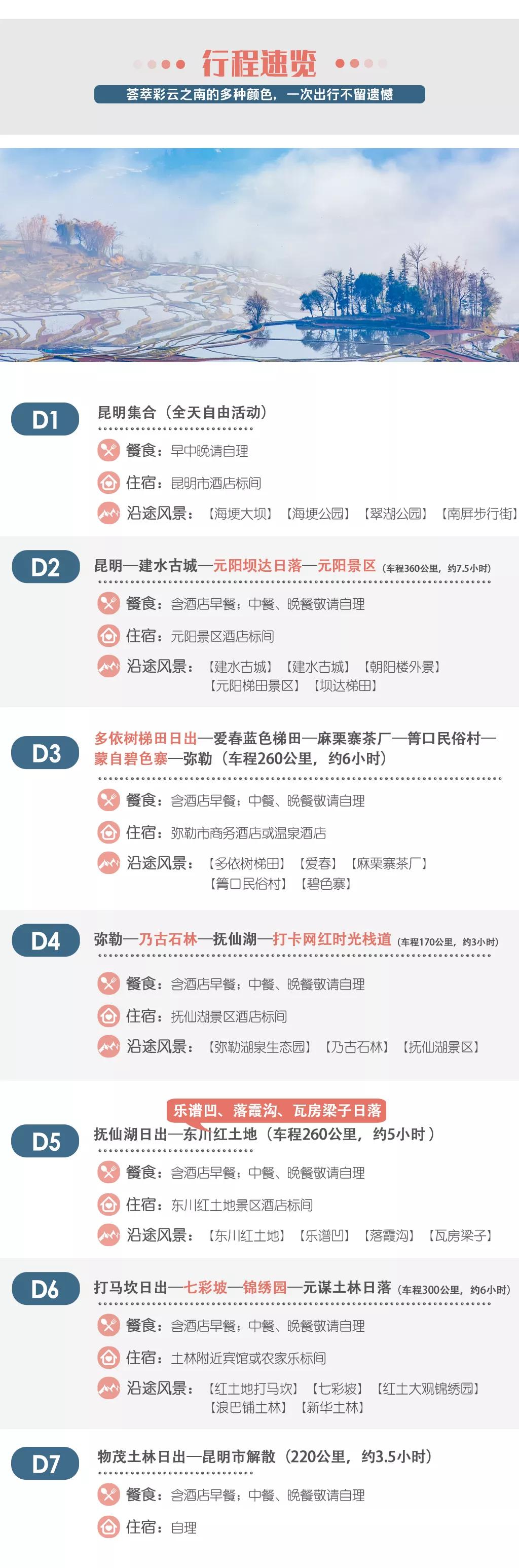 當(dāng)日行程:早晨出發(fā)前往【紅土地打馬坎】觀賞磅礴日出,之后到達(dá)【七彩坡】、【紅土大觀錦繡園】進(jìn)行拍攝;