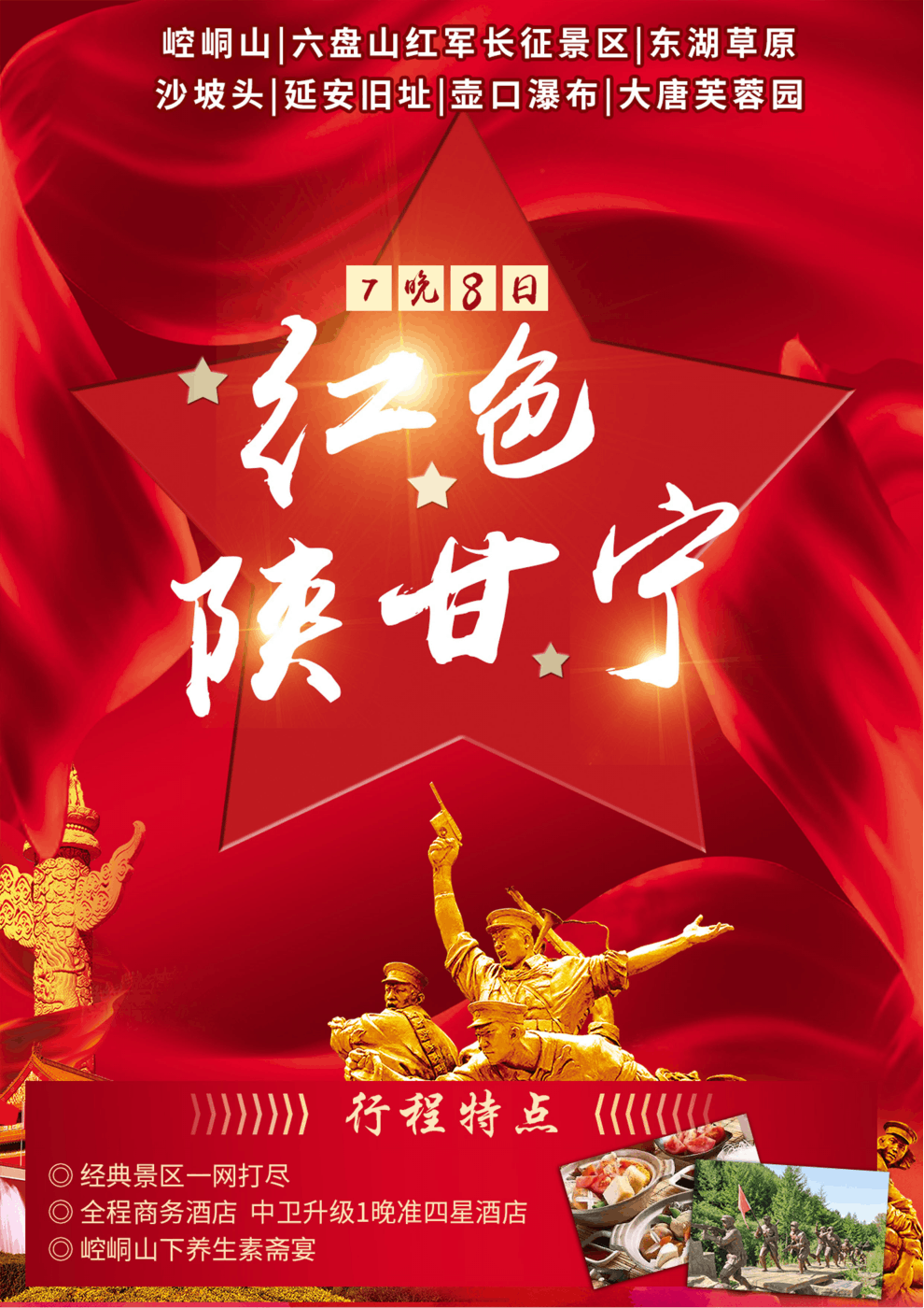 特別安排:【授旗儀式】—到達(dá)景區(qū),換上紅軍服裝,按照長征中紅一、紅二、紅四方面軍的編制,分為三隊(duì)。由活動(dòng)領(lǐng)隊(duì)致辭,向各隊(duì)隊(duì)長授旗!大家齊聲朗誦《清平樂.六盤山》,伴著“不到長城非好漢”的壯志豪情,高舉紅軍旗,身著紅軍服向山頂進(jìn)發(fā)。