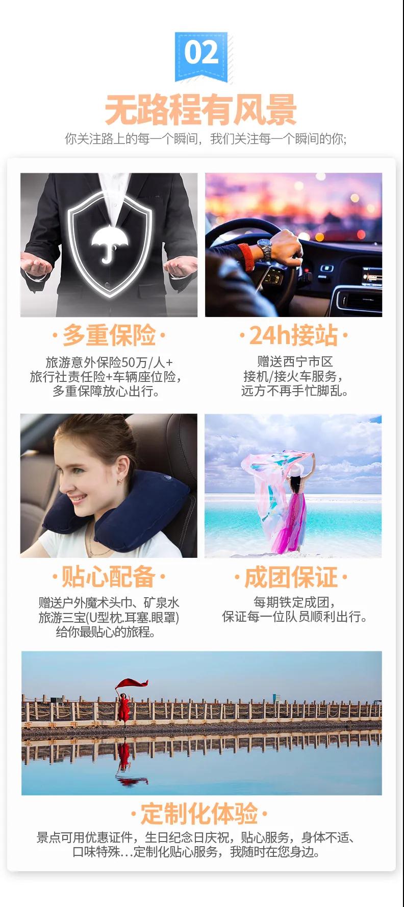 5、贈(zèng)送:贈(zèng)送西寧市區(qū)24小時(shí)接機(jī)/接火車(chē)服務(wù);贈(zèng)送戶(hù)外魔術(shù)頭巾、旅游三寶(頸枕耳塞眼罩)、礦泉水。(贈(zèng)送項(xiàng)目不用費(fèi)用不退)