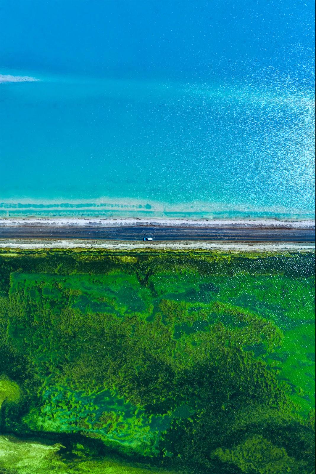我們先抵達(dá)【西臺(tái)雙色湖】,西臺(tái)吉乃爾湖的神奇之處在于一條泥路將湖水一分為二,一半是蒂芙尼藍(lán),一半是純粹的綠;左邊碧綠如玉的是淡水湖,右邊瓦藍(lán)如天的是鹽水湖,雖然他是鹽湖,但是它那獨(dú)有的特色在中國(guó)也能領(lǐng)略到堪比馬爾代夫的亮點(diǎn),顛覆了你對(duì)任何湖的想象。最重要一點(diǎn)是這里還是一個(gè)未被開(kāi)發(fā)的超小眾地方,沒(méi)有摩肩擦踵,才有更好的風(fēng)景。