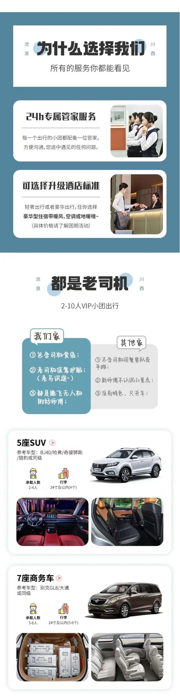 私人訂制:我們業(yè)務范圍囊括了全國各大城市,川西、西北、新疆、西藏,在路上永遠有我們的身影。我們將為每一個有定制需求的你策劃出獨屬于自己的完美旅行。