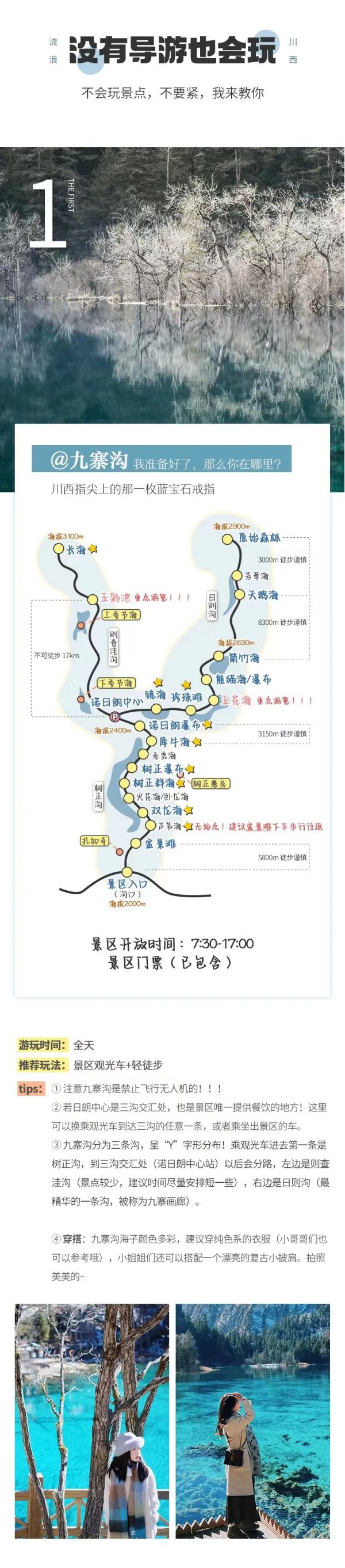 4、九寨溝景區(qū)實行分區(qū)域開放,開放區(qū)域為溝口經諾日朗瀑布至長海,扎如溝的扎如寺及日則溝的鏡海;其中,長海、五彩池、鏡海、諾日朗瀑布、樹正群海、雙龍海瀑布、扎如寺等景觀原則上為步行游覽區(qū),具體游覽方式請聽從隨車講解員安排。