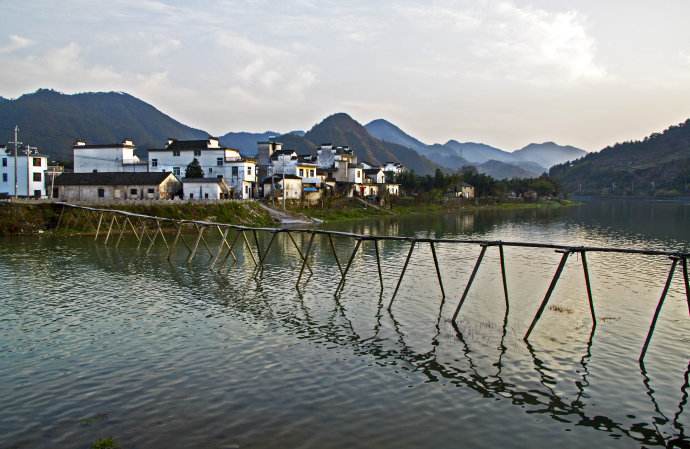 雄村,環(huán)境優(yōu)美,風水極佳。背倚翠微,面屏竹山,兩條游龍般的山脈蜿蜒其左,如虎似獅的群山雄踞其右,飄帶狀的新安江繞村東流,粉墻黛瓦,古樹掩映,山青水秀,世外桃源。