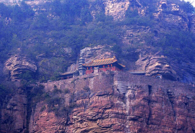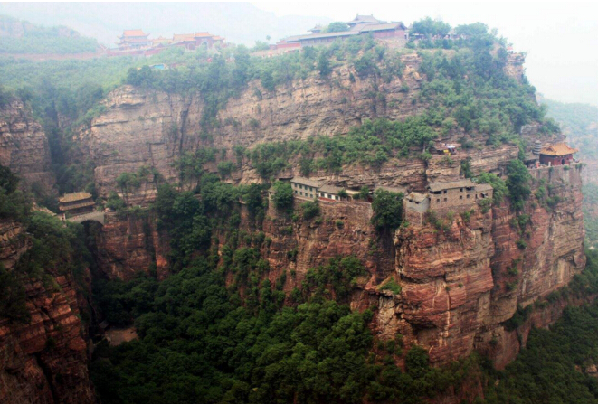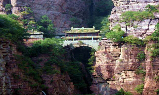 一絕“橋樓殿”。橋凌駕于百仞峭壁之間,仰視藍天一線,俯首萬丈深淵。形制如同趙州橋敞肩拱式。橋上建樓,云飛樓動,樓內(nèi)建殿,殿內(nèi)三尊大佛。真是“千丈虹橋望入微,天光云彩共樓飛”,不是仙境勝似仙境,疑是天堂落塵埃?,F(xiàn)為中國三大懸空寺之一。