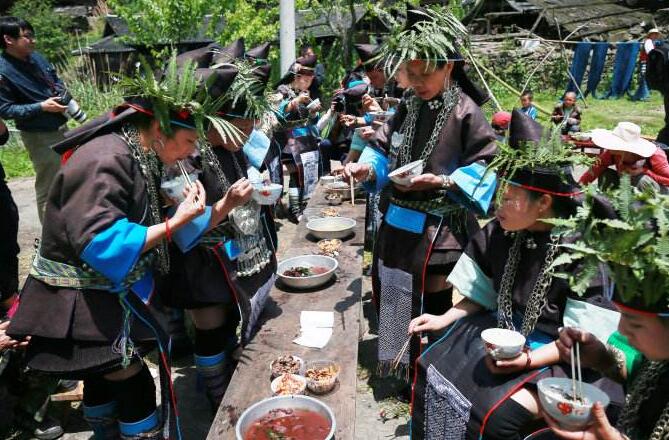 早餐后前往空申村寨依山而建,四周山巒起伏,林木蔥蔥,一條清澈的小溪從寨旁流過(guò),民居布局合理,吊腳樓鱗次櫛比。這里最為世人矚目的是每年一度的“茅人節(jié)”。每年農(nóng)歷二月至三月,成年男女青年不論年齡大小,結(jié)婚已否,凡自己樂意都可以任意找與自己情意相投的伴侶結(jié)隊(duì)到茅人坡扎茅人、對(duì)情歌、逗趣。特別意合情投者,則相互暗示,離群另尋靜處。節(jié)日氣氛熱烈、奔放、自由、浪漫。農(nóng)歷三月三,被譽(yù)為“世界超短裙故鄉(xiāng)”的榕江縣兩汪鄉(xiāng)空申苗寨人山人海,熱鬧非凡,苗族同胞歡聚一堂,慶祝自己最古老的“情人節(jié)”——茅人節(jié)。茅人節(jié)(古老的苗族情人節(jié))苗語(yǔ)為“撈沙麗”,又稱作“爬茅人坡”、“插茅人”。相傳,短裙苗族古時(shí)有本寨男女不通婚的習(xí)俗,婚姻由父母包辦,姑娘都要遠(yuǎn)嫁他鄉(xiāng),許多同寨青梅竹馬的男女不得不勞燕分飛。遠(yuǎn)嫁的姑娘陽(yáng)春三月均要返回娘家?guī)椭焊?。勞作之余,她們便帶著“三月粑”邀約寨里的未婚姑娘和小伙子到山上唱歌,用歌聲抒發(fā)與心上人被迫分離,遠(yuǎn)嫁他鄉(xiāng)的傷悲,并勸告未嫁的妹妹不要遠(yuǎn)嫁,向情人傾訴內(nèi)心深處的思念。唱到后來(lái)常常是淚水漣漣,泣不成聲。為了表達(dá)對(duì)家鄉(xiāng)和情人的依戀,她們用新的嫩綠枝葉和茅草扎成高低大小不等的“茅人”把,捆在杉樹桿上,然后插在最高的山頂上,一般插兩邊低排列,中間最高的象征大姐,兩邊低的為妹妹,寄予姐妹情意。我們結(jié)束游覽,返回榕江入住休息。