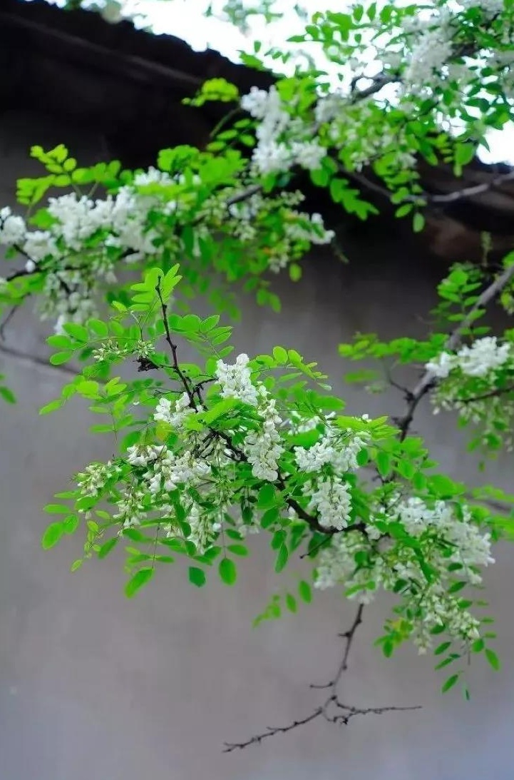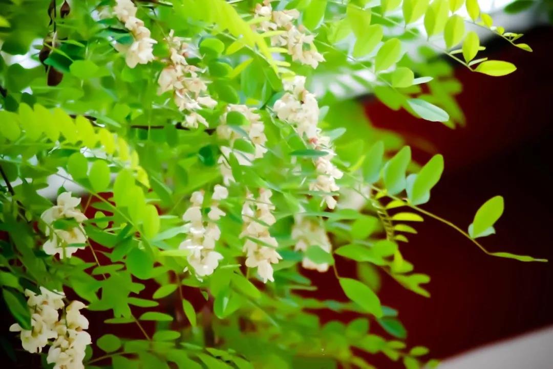 串串槐花懸于枝頭遠(yuǎn)遠(yuǎn)望去白花花的一片似白雪蓋樹
