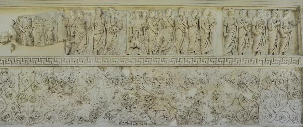這是古羅馬最著名的紀(jì)念壇之一,壇壁上細(xì)膩的雕刻著這位偉大的帝王與他生命中最親密的一群人,他們姿態(tài)優(yōu)雅的走在一列隊(duì)伍中,好似相扶攙扶,共同創(chuàng)造了那個(gè)偉大的時(shí)代。