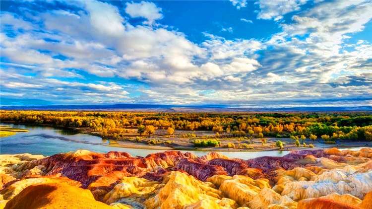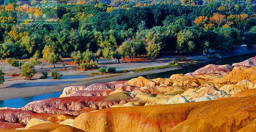 【五彩灘】(游覽時間60分鐘)五彩灘位于新疆北部,五彩灘又名五彩河岸,我國唯一的一條注入北冰洋的河流。五彩灘地貌特殊, 山勢起伏、顏色多變,其是由激猛的流河侵蝕切割以及狂風侵蝕作用而共同形成。由于河岸巖層間抗風化能力的強弱程度不一而形成了參差不齊的輪廓,這里的巖石顏色多變,且在陽光照射下,巖石的色彩以紅色為主,間以綠、紫、黃、白、黑及過渡色彩,色彩斑斕、嬌艷嫵媚,因此被稱作“五彩河岸”、是“新疆最美的雅丹地貌”。