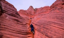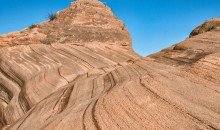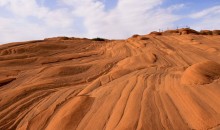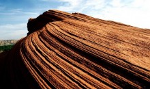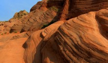 波浪谷是一種紅砂巖地貌,因巖砂上的紋路像波浪而得名,巖石上纖細(xì)的紋路,揭示了沙丘沉積的運(yùn)動(dòng)過程,紋路的變化反映出每一層砂巖隨著沉積礦物質(zhì)的含量不同,而產(chǎn)生的顏色深淺差異,紅色主要是由鐵和錳的氧化而產(chǎn)生,這些顏色往往在交錯(cuò)處和角落里形成更加復(fù)雜與抽象的圖案。它的紋理線條比較清晰,像是一層層的波浪,也圍繞著波浪起伏的小山丘形成了不同的走向,極其具有觀賞性。