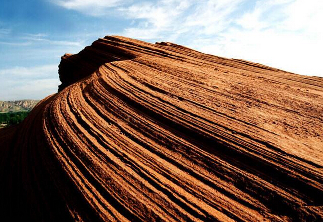 龍洲的紅砂巖被厚重的黃土所覆蓋,經(jīng)過數(shù)千萬年的風(fēng)蝕和水蝕,顯露出孤立的山峰和形態(tài)各異的奇巖怪石。其中以波浪谷最為著名,波浪谷展示的是由數(shù)百萬年的風(fēng)、水與時(shí)間交織,雕琢砂巖而成的奇妙世界。波浪谷巖石的復(fù)雜層面,是由一億五千萬年前侏羅紀(jì)就開始沉積的巨大沙丘組成,沙丘被一層層浸漬了地下水的紅沙所覆蓋,天長(zhǎng)日久,水中的礦物質(zhì)把沙凝結(jié)成了砂巖,形成了層疊狀的結(jié)構(gòu),正如時(shí)光在靖邊大地上留下的指紋。