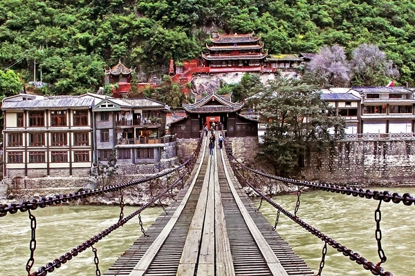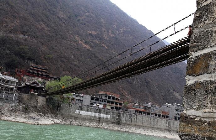 發(fā)展歷史:瀘定橋兩岸的橋頭古堡為傳統(tǒng)木結(jié)構(gòu)古建筑,瀘定橋俯瞰為中國獨有。該橋始建于清康熙44年(1705年),建成于康熙45年(1706年)??滴跤P題寫"瀘定橋",并立御碑于橋頭,兩岸橋頭堡為木結(jié)構(gòu)古建筑,風貌獨特系國內(nèi)獨有。中國工農(nóng)紅軍在長征途中“飛奪瀘定橋”,使之成為中國共產(chǎn)黨重要的歷史紀念地。