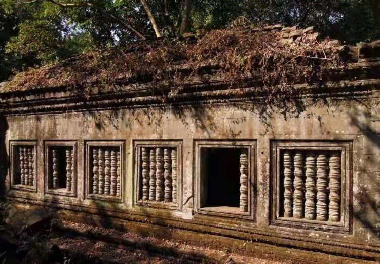 崩密列建于11世紀末到12世紀初,即Suryavarman II時期。這座印度廟宇是用來供奉濕婆神的,是吳哥建筑群第一座完全用沙石建筑的廟。這是一座破敗、隱秘,未經(jīng)修繕的寺廟,這座神廟從來沒有完工,原本應(yīng)該有浮雕的寺墻上都空空如也。正由于它的原始風貌,有人說這里是吳哥遺跡群中最值得去同時也是最難前往的遺跡。