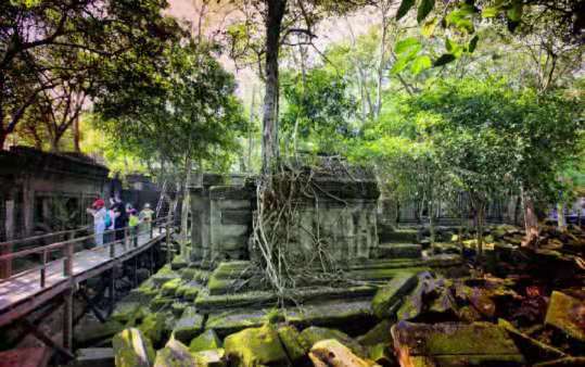 崩密列的護城河長1.2公里,寬0.9公里,它和吳哥寺幾乎一樣大的規(guī)模,但依然被叢林嚴密包裹著。由于比較荒僻,所以很多浮雕和塑像已被掠奪,但寺廟的神秘氣氛仍舊在森林深處彌漫。