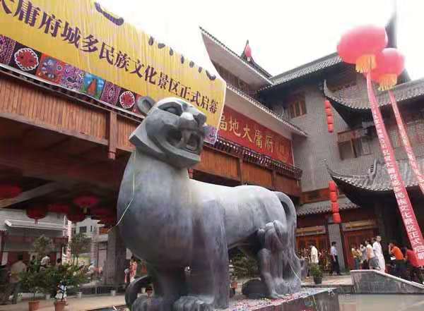 古庸國里這一感恩于虎的故事代代相傳,經(jīng)久不息。土家人尚虎,虎是土家人的圖騰。人們景仰施愛于世人的恩虎,即塑像一尊,陳于府城,播灑愛情,傳揚平安。據(jù)說,這尊虎乳銅雕是目前國內(nèi)最高大的銅虎(此虎凈重約4噸),由青銅鑄造?;⒌纳硐掠幸粋€小孩兒和一只小老虎在吃奶??磥?,這虎應(yīng)該是張家界的標(biāo)志了,就如同獅是新加坡的標(biāo)志一樣。