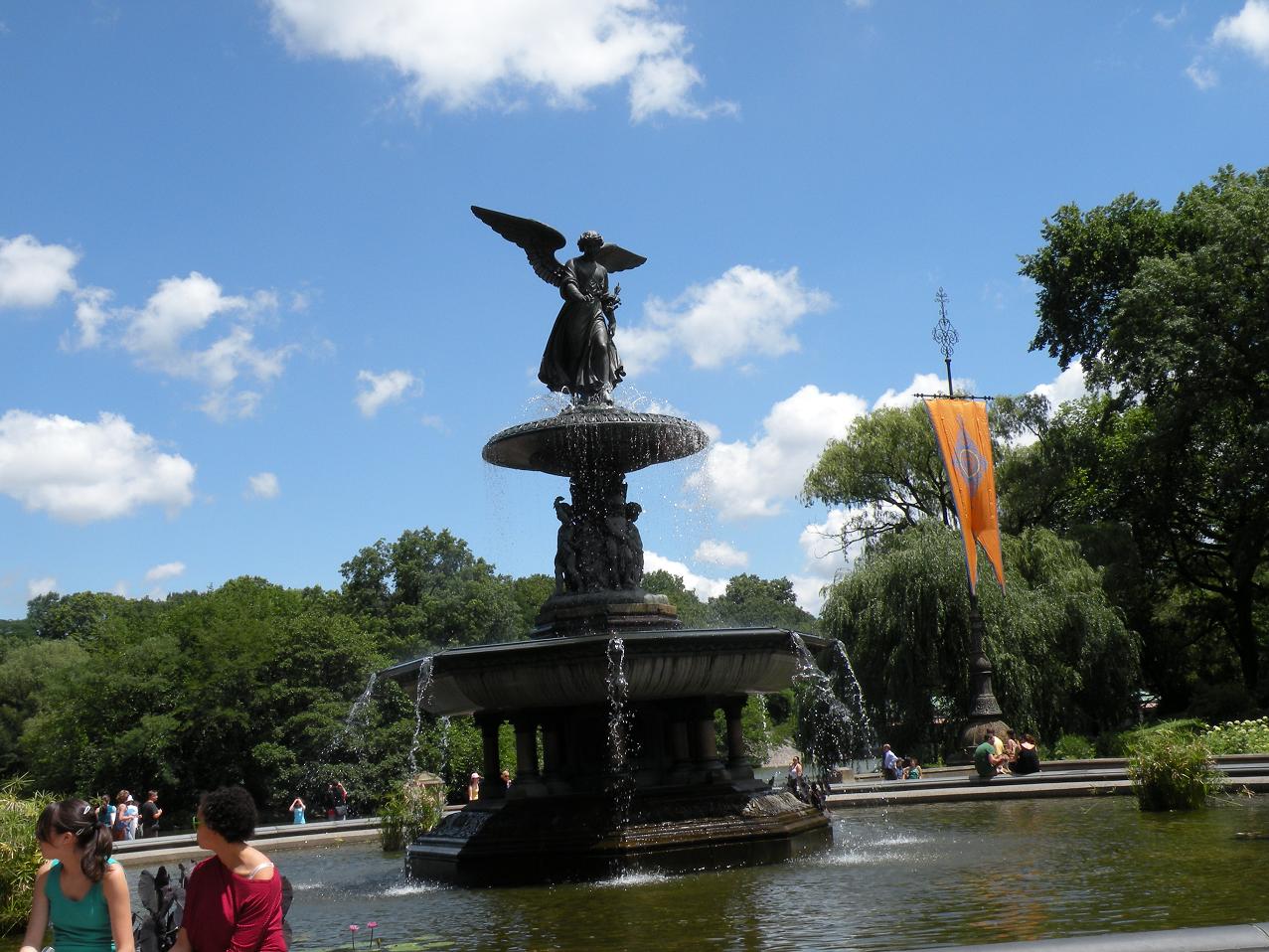 畢士達噴泉 (Bethesda Fountain) 及廣場位于湖泊與林蔭之間,是中央公園的核心,噴泉建于 1873 年,為了紀念內(nèi)戰(zhàn)期間死于海中的戰(zhàn)士,而畢士達之名則是取自圣經(jīng)的故事,內(nèi)容敘述在耶路撒冷的一個水池因天使賦予的力量,而具有治病的功效,“水中天使” (The Anger of Water) 的雕像,則是取自 Tony Kushner 的史詩戲劇作品“天使在美國” (Anger in America) ,而圍在噴泉旁的四座雕像分別代表“節(jié)制”、“純凈”、“健康”與“和平”。這座水池常常有成群天鵝悠游其間,也有不少游客在湖中劃船。