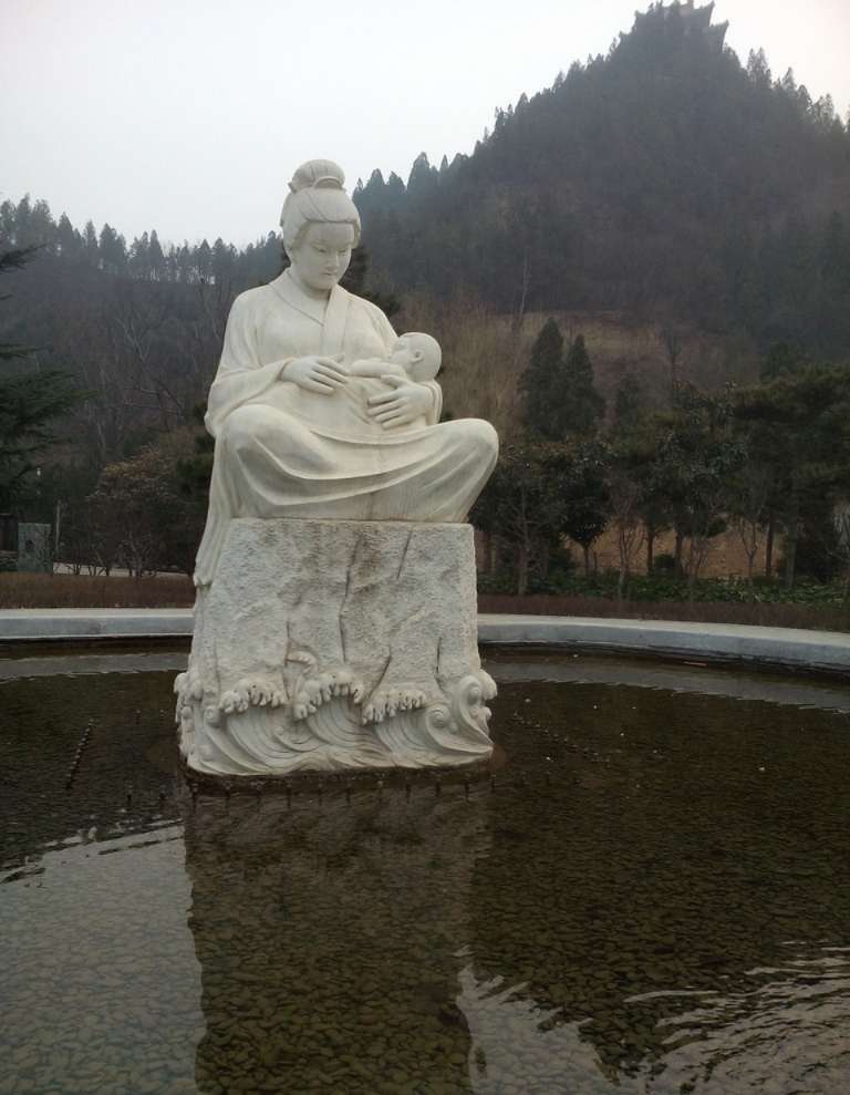 笑,顯得頑皮可愛,象征著黃河母親愛護保護著中華人民。雕塑構圖洗練,寓意深刻。雕塑下基座上刻有水波紋和魚紋圖案,源自甘肅古老彩陶的原始圖案。