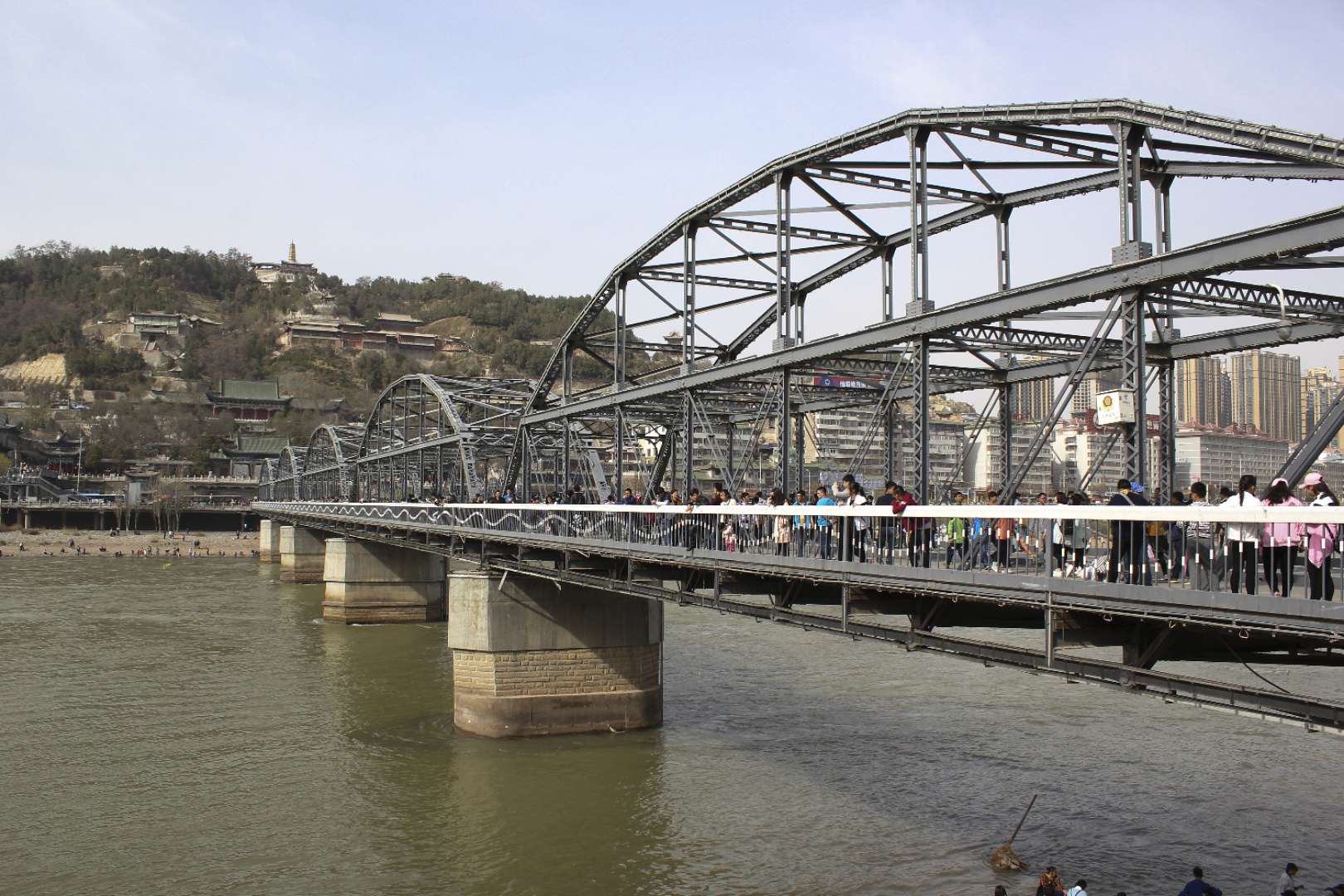 黃河鐵橋位于蘭州城北的白塔山下、金城關前,有"天下黃河第一橋"之稱,是蘭州市內(nèi)標志性建筑之一。鐵橋建成之前,這里設有浮橋橫渡黃河。浮橋始建于明洪武年間(公元一三六八至一三九八年),名叫鎮(zhèn)遠橋,今尚存建橋所用鐵柱一根高達三米,重約數(shù)噸,上有"洪武九年"字樣。