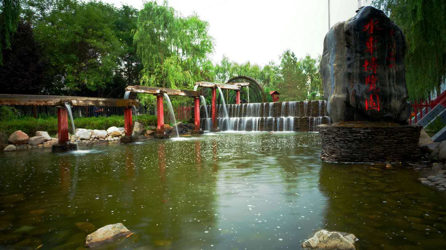 在水磨房出水處我們有一條蜿蜒小渠名為“曲水流觴“。再現(xiàn)九曲黃河內水車林立、悠悠旋轉的景象。