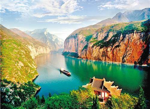 瞿塘峽雖然僅八公里長(zhǎng),卻是最令人屏息的一段江峽。兩岸如削,巖壁高聳,大江在懸崖絕壁中洶涌奔流,自古就有“險(xiǎn)莫若劍閣,雄莫若夔”之譽(yù)。瞿塘峽是三峽中最短的一個(gè)峽,西起重慶奉節(jié)縣的白帝城,東到巫山縣的大溪鎮(zhèn),全長(zhǎng)雖然只有8公里,但卻有“西控巴渝收萬(wàn)壑,東連荊楚壓群山”的雄偉氣勢(shì)。在三段峽谷中,它最短,最狹,最險(xiǎn),氣勢(shì)和景色也最為雄奇壯觀。其“雄”首先是山勢(shì)之雄。游人進(jìn)入峽中,但見(jiàn)兩岸險(xiǎn)峰上懸下削,如斧劈刀削而成。山似拔地來(lái),峰若刺天去。峽中主要山峰,有的高達(dá)1500米。瞿塘峽中河道狹窄,河寬不過(guò)百余米。最窄處僅幾十米,這使兩岸峭壁相逼甚近,更增幾分雄氣。其中峽之西端的夔門尤為雄奇。它兩岸若門,呈欲合未合之狀,堪稱天下雄關(guān)。瞿塘之雄還在于水勢(shì)之雄。古人詠瞿塘:“鎖全川之水,扼巴蜀咽喉”。瞿塘峽雖然較短,但峽小景不少。我們將上溯逐一游覽。