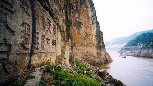 在長(zhǎng)江的白鹽山上,有一塊巖壁的顏色和其他地方不一樣,呈現(xiàn)出粉紅色,這里就叫做粉壁墻。而在粉壁墻上,則有著名的瞿塘摩崖題刻。在這些眾多的摩崖題刻里,比較有名的、也可以說(shuō)形體比較大,大家在船上能清晰地看見(jiàn)的有兩個(gè),一個(gè)是由孫元良將軍寫的“夔門天下雄,艦機(jī)輕輕過(guò)”,寫出了瞿塘峽特色所在;另一個(gè)是著名的愛(ài)國(guó)將領(lǐng)馮玉祥將軍所寫的“踏出夔巫,打走倭寇”,以激勵(lì)由此出川抗日的將士。
