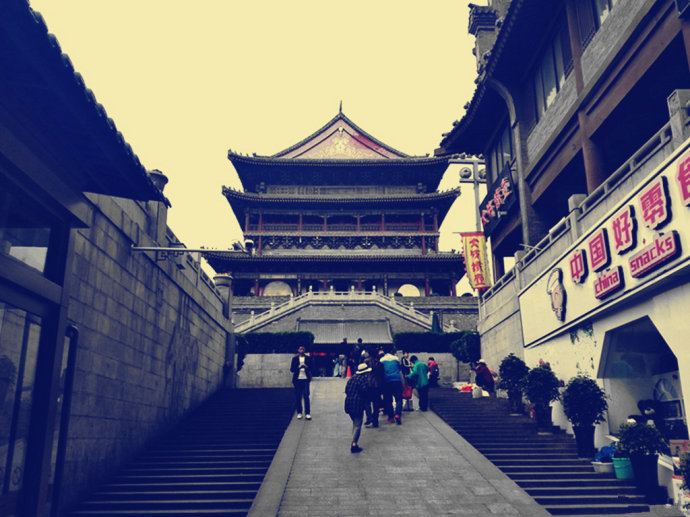 西安鼓樓始建于明洪武十三年(1380年),比鐘樓早建4年。樓上原有巨鼓一面,每日擊鼓報時,故稱“鼓樓”。鼓樓橫跨北院門大街之上,和鐘樓相距僅200米,互相對應。