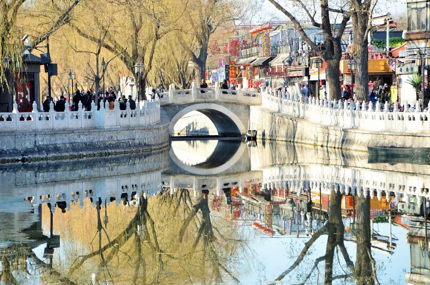 元代營建新大都后這里已是船泊必經(jīng)之處,兩岸商事繁華,又是風(fēng)景勝地。遼、金時代雖是郊外,數(shù)公里長的水系兩岸也應(yīng)有便橋方便來往。明代史籍已有明確的記載。解放初期,當(dāng)我們站在銀錠橋頭平目西望,遠(yuǎn)處藍(lán)天下的青山綿延起伏,湖邊搖曳的柳絲楚楚動人,猶如掛在空中美麗的巨幅圖畫,每當(dāng)夕陽西下,金色的余輝從山后撒播在湖面上,微波粼粼,金光閃閃,迷人的湖光山色令人流連忘返,可惜后來的煙囪和高樓大廈嚴(yán)重地破壞了京城這難得的獨特景觀,但愿這遺憾和教訓(xùn)不再發(fā)生。