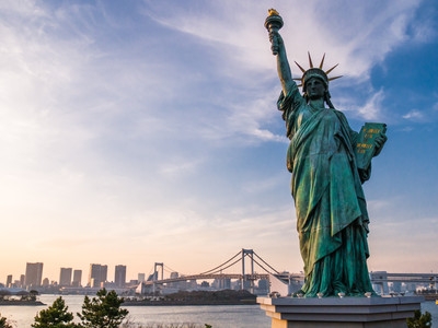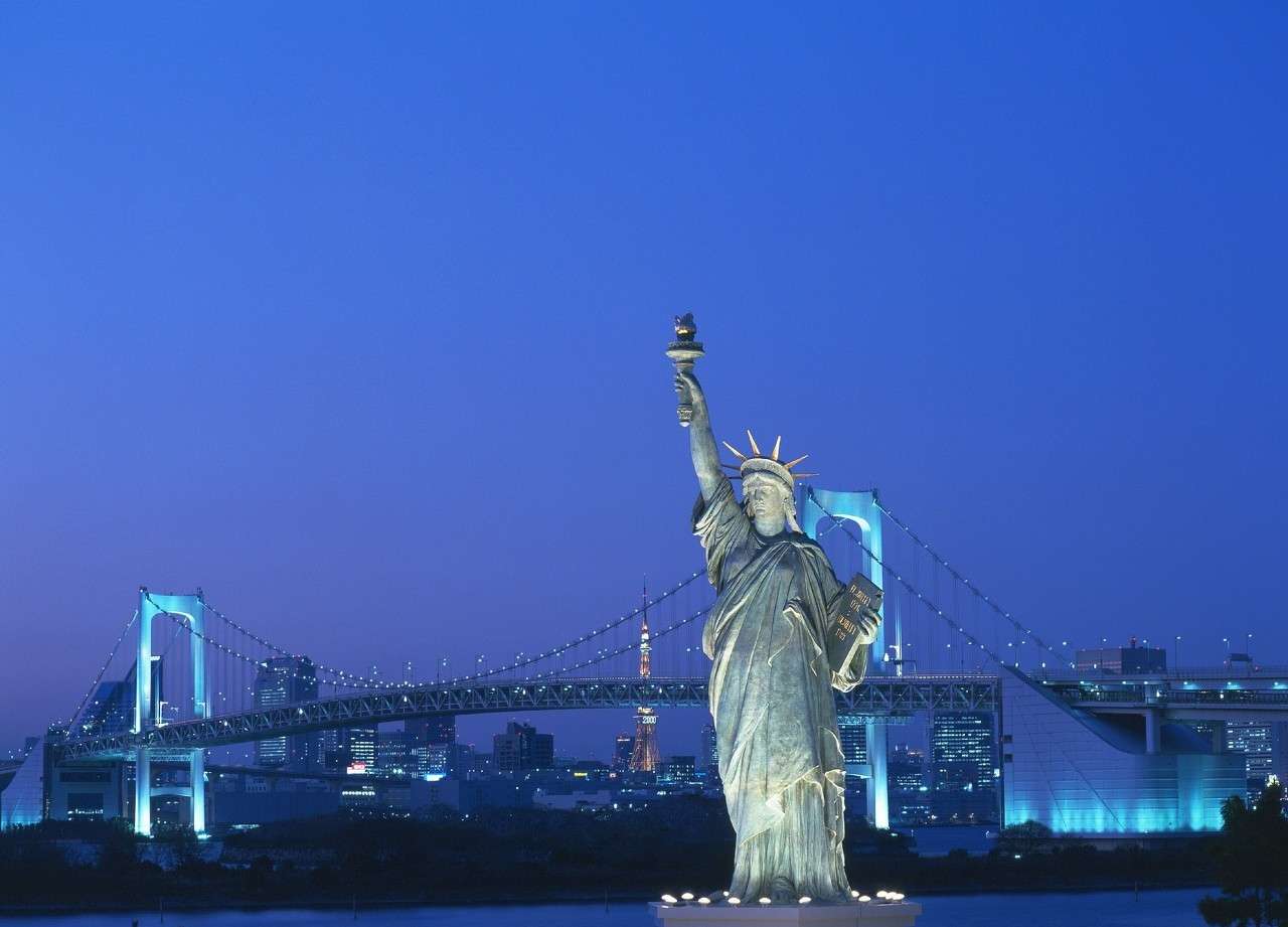 現(xiàn)在設(shè)置在臺場的自由女神像,是原物歸還后,在回應一片惋惜聲中制作的復制品,雖然如此,現(xiàn)在她已變成臺場的標志。以彩虹大橋為背景,與女神一起合影留念是不可缺少的活動項目了。