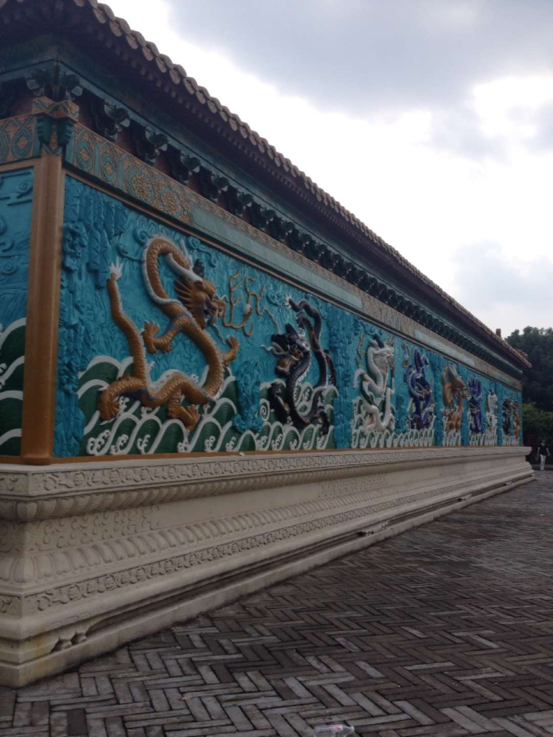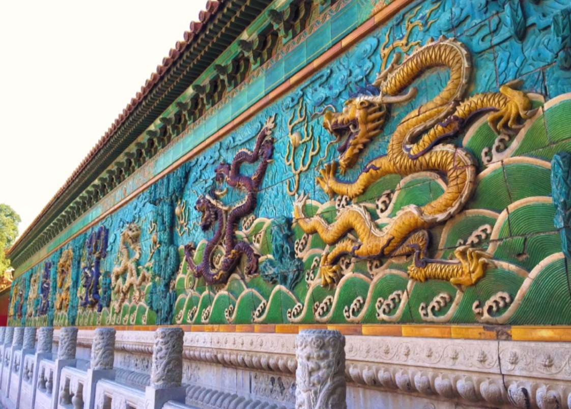 九龍壁座南向北,全長45.5米,高8米,厚2.02米。它的建造年代比北京北海九龍壁早250年,體積是北海九龍壁的三倍,是中國現(xiàn)存規(guī)模最大,建筑年代最早的一座龍壁。九龍壁由426塊特制的五彩琉璃構(gòu)件拼砌而成,由壁座、壁身、壁頂三部分構(gòu)成。龍與龍之間,由水草山石圖案相連,互相烘托。版權(quán)所有山東聊城聊之旅國際旅行社有限公司,轉(zhuǎn)載必究!壁身上部覆蓋仿木構(gòu)廡殿頂,兩側(cè)有高浮雕蓮花和游龍等圖案。下部須彌座以藍(lán)綠兩色琉璃瓦磚砌筑束腰的75塊琉璃磚上浮雕出象、獅、飛馬、麒麟、狻等動(dòng)物形象。龍壁東西兩端分別是旭日東升和明月當(dāng)空的圖案,并襯有江崖海水,流云紋飾。龍壁前有一個(gè)長方形的倒影池,九條飛龍倒映水中,水動(dòng)龍游,妙趣橫生。