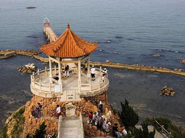 渤海雄渾之日落,南瞻“八仙相聚”的蓬萊閣,北眺遼東半島的老鐵山。仙境源東部開口處臨海而立,頓感開闊,該村人在此建一亭閣,高大約16米,順懸崖勢造陡峭臺階,左拐延伸出了一架棧橋,棧橋周圍劃出幾處釣魚臺與海上游樂場;右拐直達(dá)至海灘,四周懸崖峭壁圍成一處半圓灣,實屬一靜謐之所,灘上卵石約 3 米厚,光潔與柔潤。身臨仙境源、心情舒暢、飄然欲仙!