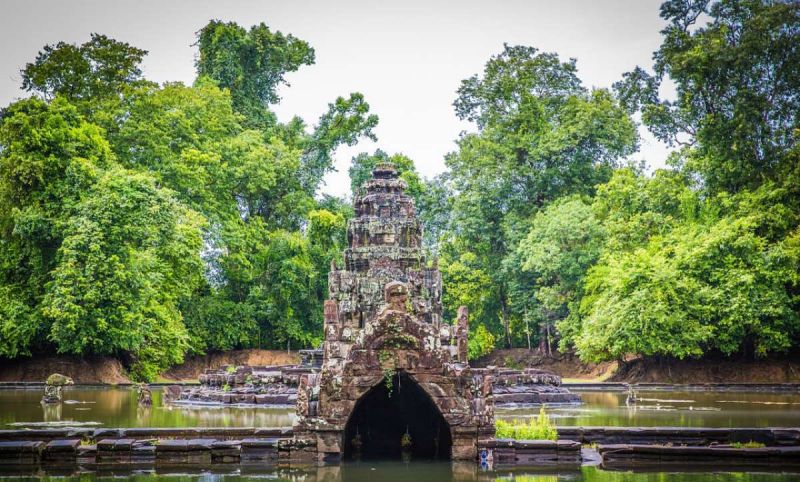 加亞華爾曼七世(JayavarmanⅦ)在位時期,積極進行各項建筑工程,史學者認為他在位37年中,以攸關民生生活所需的公共工程為第一優(yōu)先,包括蓋水庫、鋪路修橋、建101所驛站、102所醫(yī)院……,其中涅盤宮(Neak Pean)算是一座寺廟療養(yǎng)所,在當時是一個大醫(yī)院。即使在今日,柬埔寨人還是相信蛇廟的神奇藥療,雖然水池荒廢已久,柬埔寨人前往蛇廟參觀,也想采摘長在水池土地里的植物,拿回家做藥浴。而大水池(被稱為圣池)是為病人沐浴而設,現在水已經干涸。