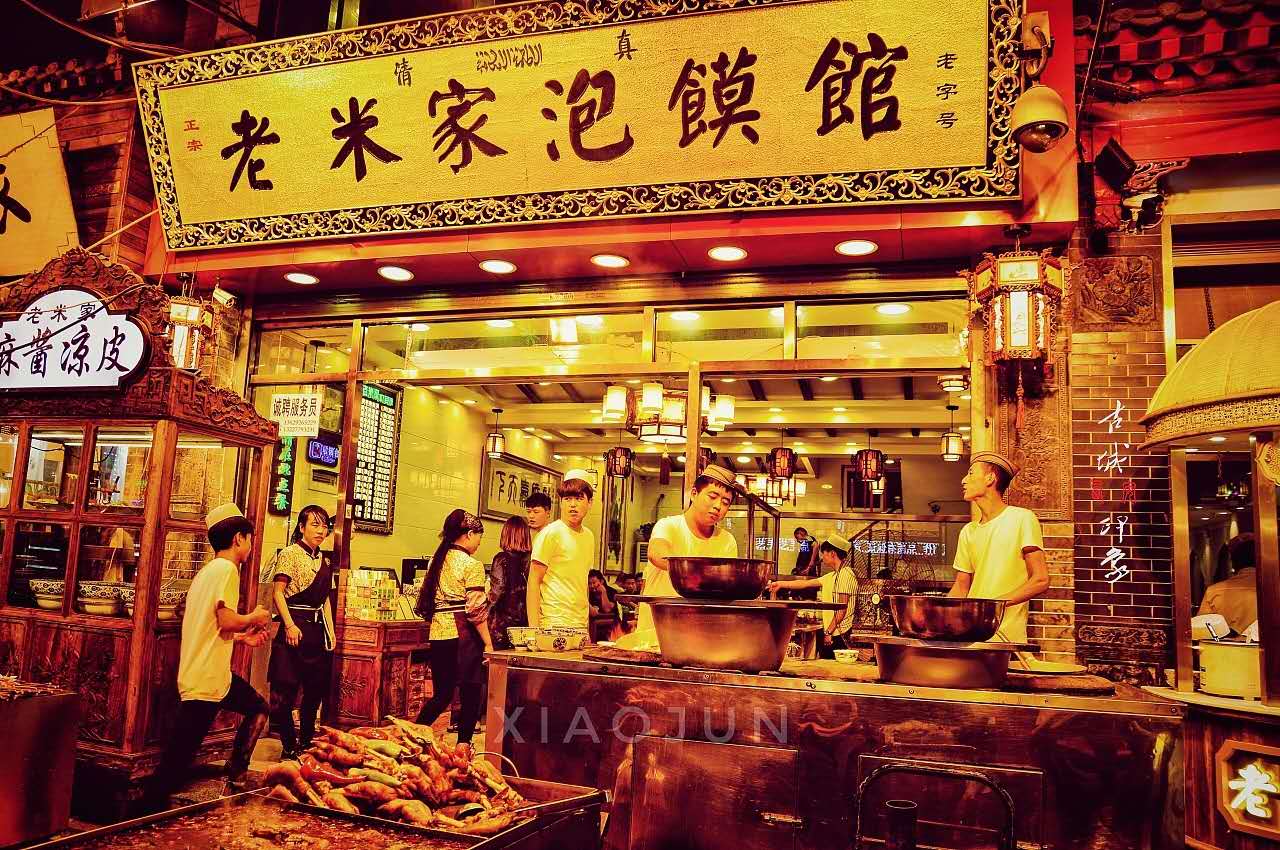晚上的回民街有著與白天不同的精彩,整條街被濃厚的市井氣息籠罩,道路兩旁遍布掛著電燈、汽燈的各種攤鋪,主要販賣糕餅、干果、蜜餞、小吃。這些小攤后面則是許多經(jīng)營當?shù)仫L(fēng)味小吃的飯館,人多時不光店里人