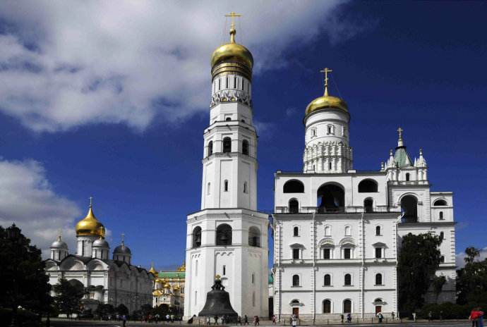 人們從遠(yuǎn)處遙望克里姆林宮,不難發(fā)現(xiàn)有一座建筑高高地矗立在建筑群體中,有鶴立雞群之感。這個(gè)高大建筑就是教堂廣場(chǎng)上的伊凡大帝鐘樓。它高81米,是古時(shí)的信號(hào)臺(tái)和望臺(tái)。鐘樓的左側(cè)有重達(dá)40 噸的炮王,右側(cè)是著名的鐘王。這兩個(gè)龐然大物雖然從未使用過(guò),但卻顯示出了俄羅斯工匠高超的鑄造技術(shù)。
